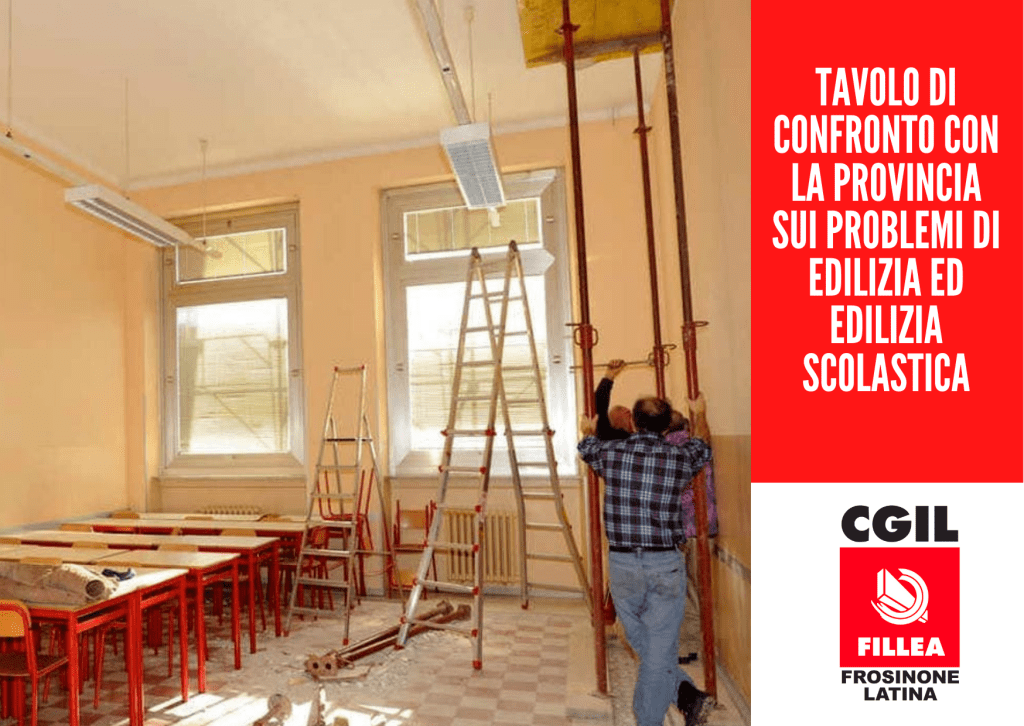 Ieri, giovedì 16 giugno, la FILLEA CGIL di Frosinone e Latina – a seguito dello spiacevole evento della caduta del controsoffitto della palestra (adibita ad aula per mancanza di spazi) presso l’IIS Guglielmo Marconi di Latina, avvenuto il 6 maggio – ha tenuto un importante incontro presso la Provincia di Latina di concerto con la FILCA CISL e la FENEAL UIL, in cui al centro è stata posta l’esigenza di puntare i riflettori sulle problematiche relative all’edilizia scolastica, alla messa in sicurezza dei luoghi della formazione abitati quotidianamente da studentesse e studenti, docenti e personale scolastico, affinché sia costante il monitoraggio di regolarità, efficienza e sicurezza nei luoghi del sapere.