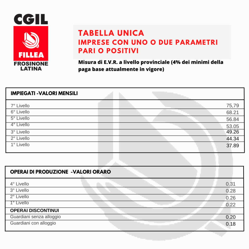 La verifica degli indicatori è stata effettuata raffrontando il biennio 2022/2021/2020 sul triennio 2021/2020/201/; all’esito della verifica effettuata a livello territoriale, risultano positivi quattro indicatori su quattro pertanto le imprese sono tenute ad erogare ad operai e impiegati gli importi EVR come da tabella
