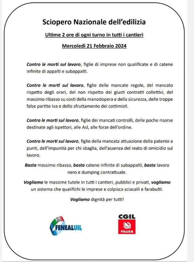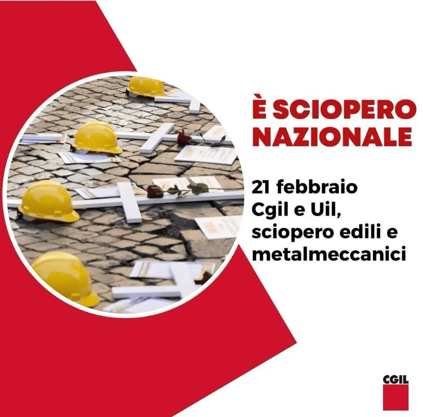 - Mercoledì 21 febbraio sciopero nazionale degli edili e dei metalmeccanici nelle ultime due ore di ogni turno.