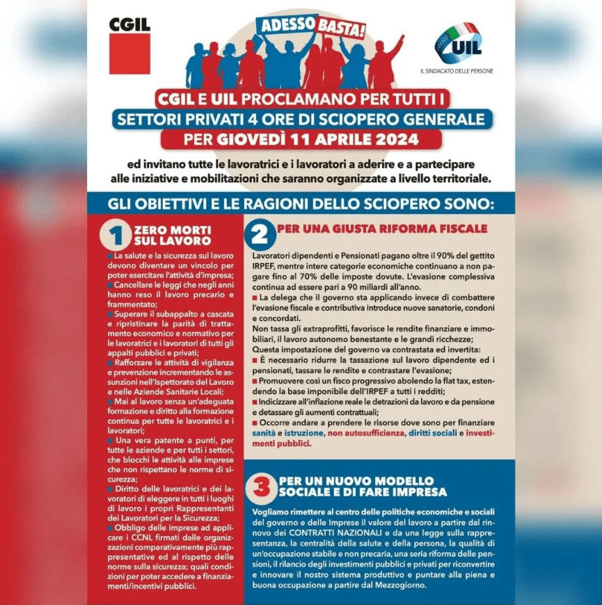 Ricordiamo che lo stop lavorativo del prossimo 11 aprile interesserà tutti i settori privati con uno sciopero di quattro ore, mentre il settore dell’edilizia sarà fermo per otto ore. Questa mobilitazione sarà accompagnata da una serie di iniziative di protesta e sensibilizzazione a livello nazionale e regionale, che coinvolgeranno lavoratori, sindacati e cittadini per portare all’attenzione pubblica alcuni temi di cruciale importanza per il futuro del lavoro e della società.