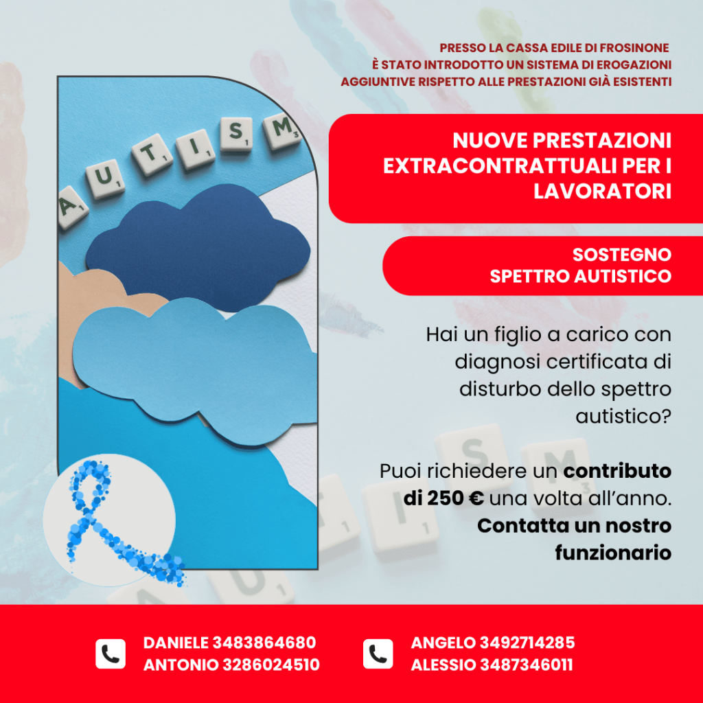 Riservato ai giovani lavoratori fino a 26 anni che abbiano maturato almeno 1.500 ore presso la Cassa Edile di Frosinone nel triennio precedente, con un contributo una tantum di 650 € lordi. - Sostegno Disturbo Spettro Autistico