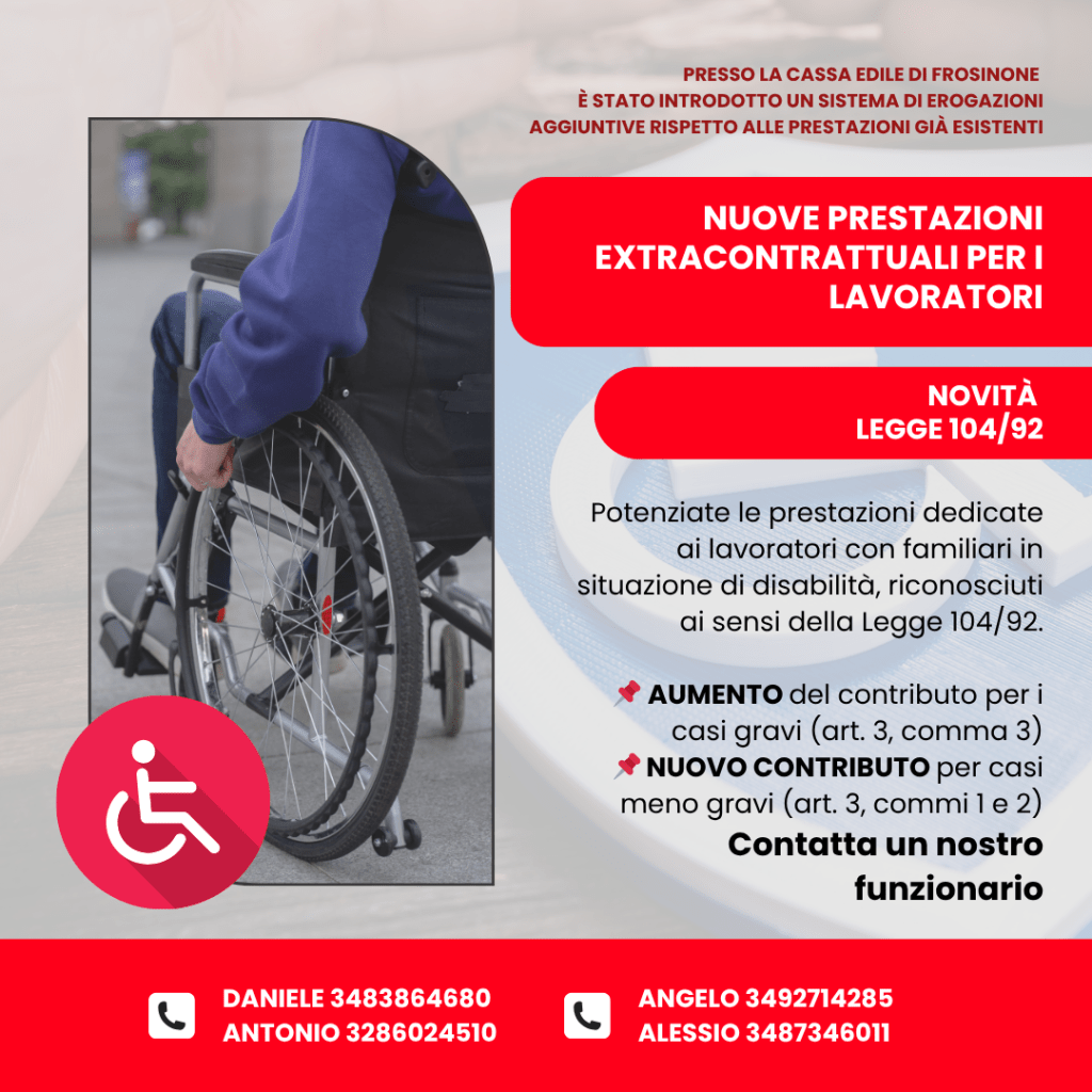 Un sostegno economico per chi ha un ISEE sotto i €13.000, ha maturato 2100 ore (di cui 1500 a Frosinone), ha anzianità su base APE ed è attualmente in forza. - Novità Legge 104/92