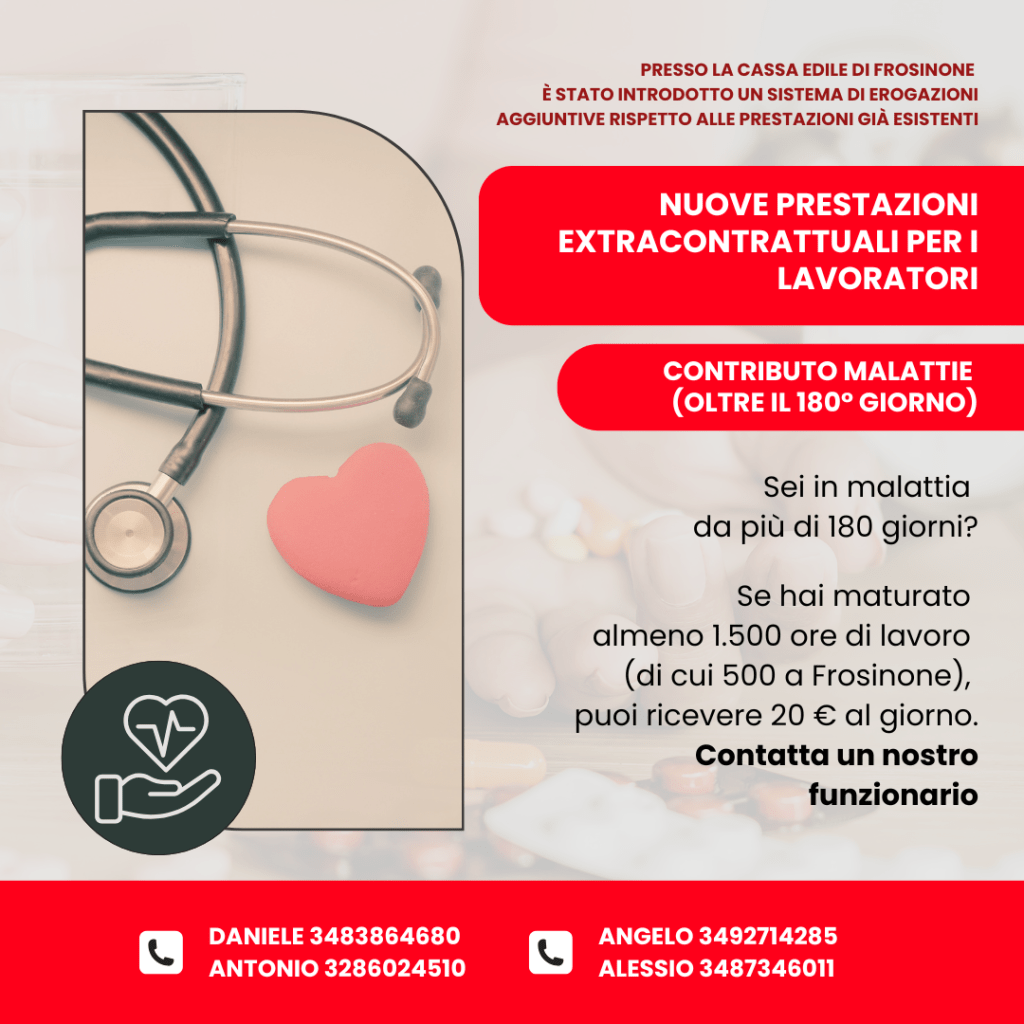 Un aiuto economico per i lavoratori che abbiano maturato almeno 1.500 ore di lavoro, di cui 500 nel territorio di Frosinone, e che siano in malattia oltre il 180° giorno (fino al 270°). L’importo erogabile è di 20 € al giorno. - Contributo Nascita