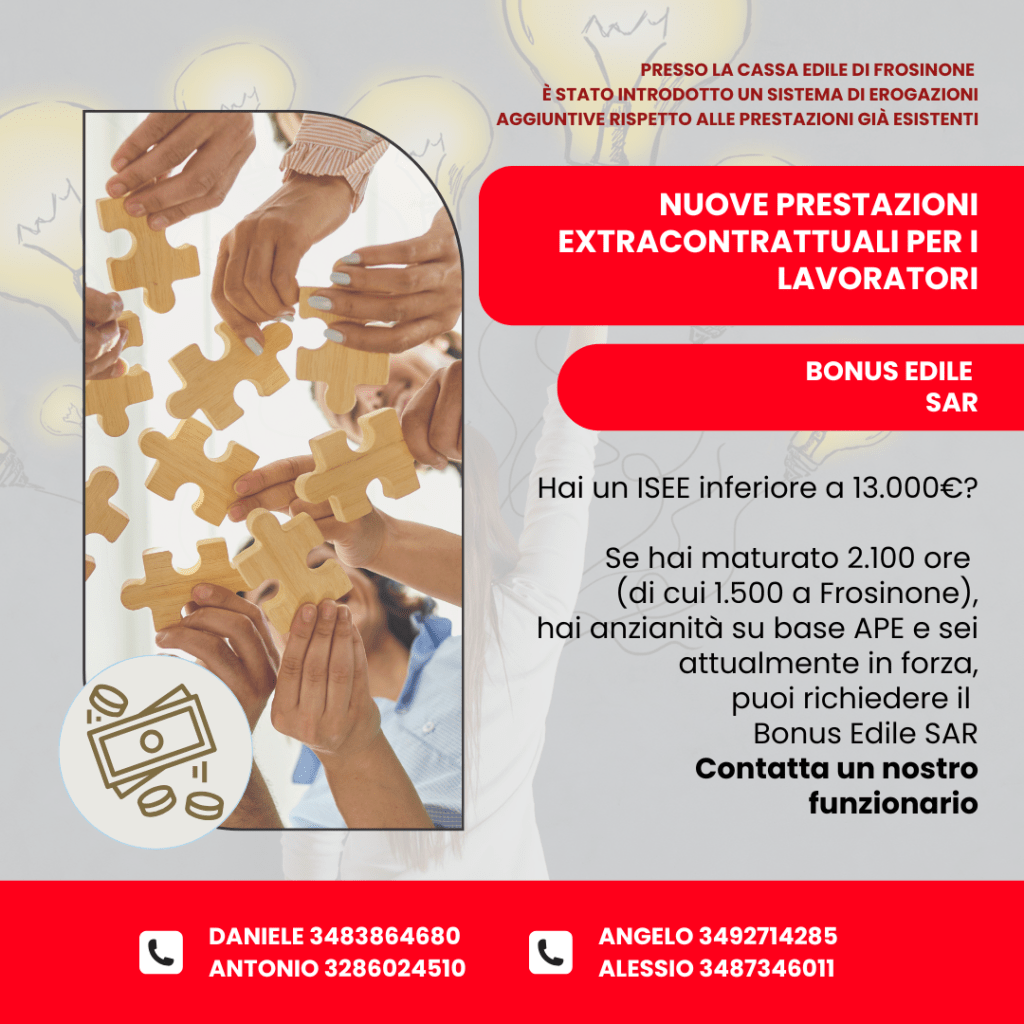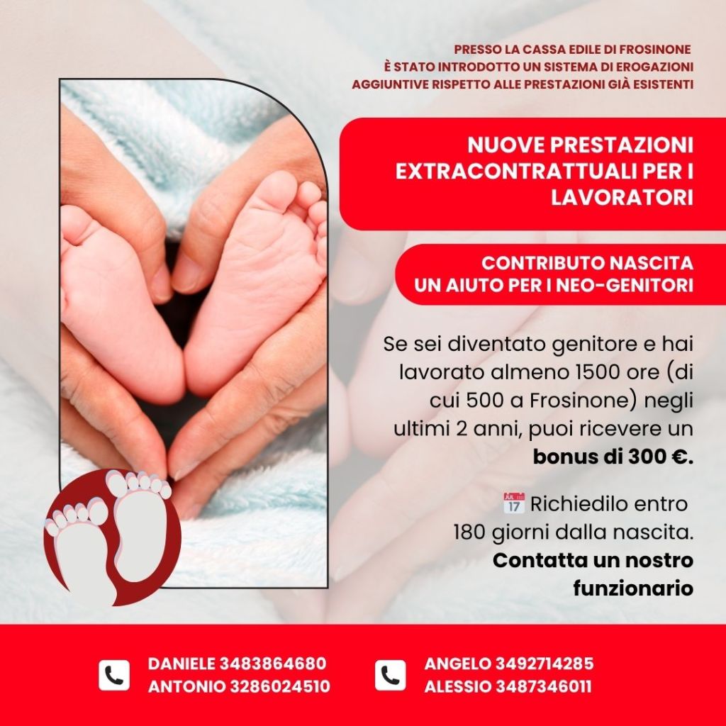 Contributo di 300 € a favore dei lavoratori che abbiano maturato almeno 1.500 ore nel biennio precedente alla nascita del figlio (di cui 500 ore a Frosinone), con una presentazione della domanda entro 180 giorni dall’evento. - Bonus Edile SAR